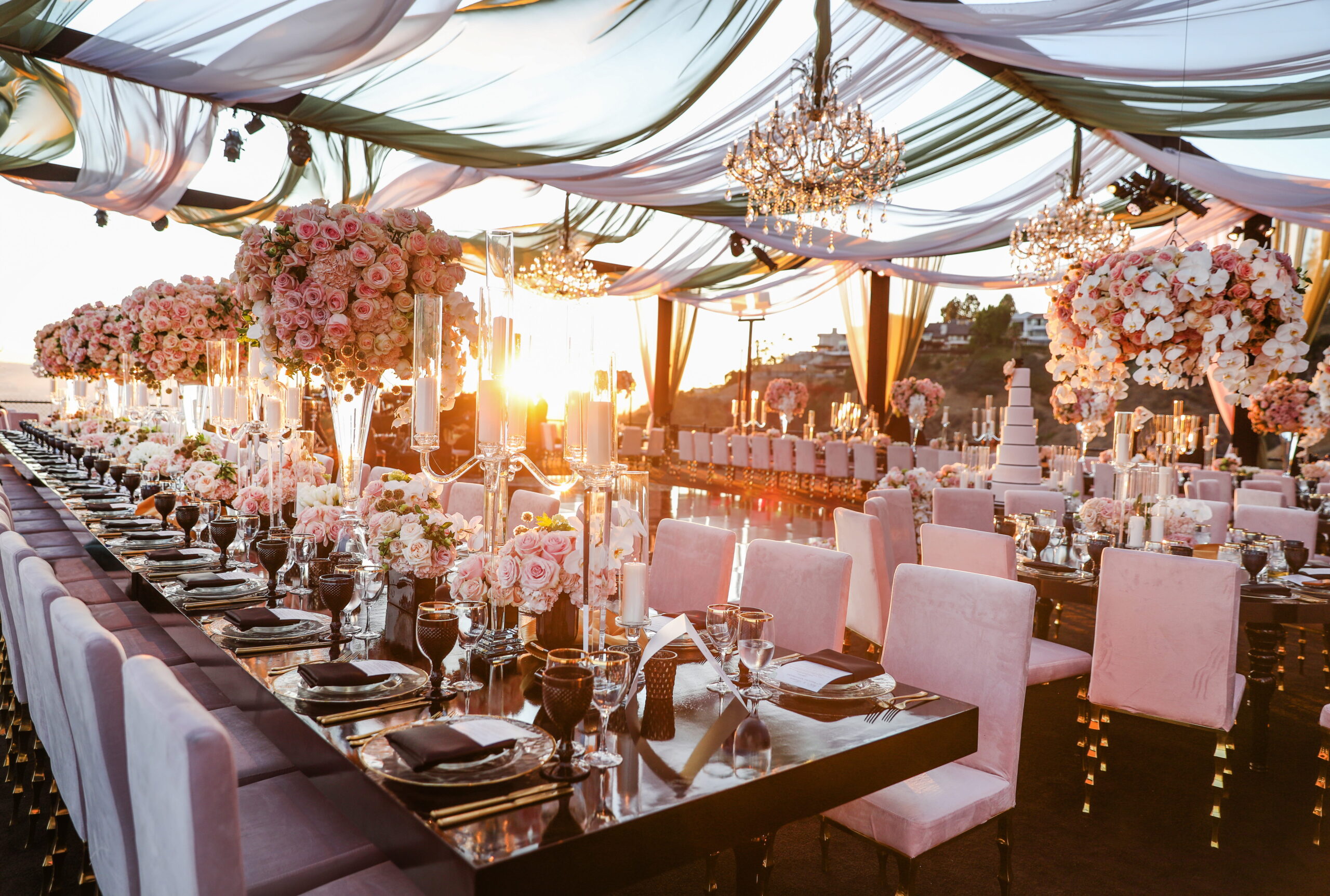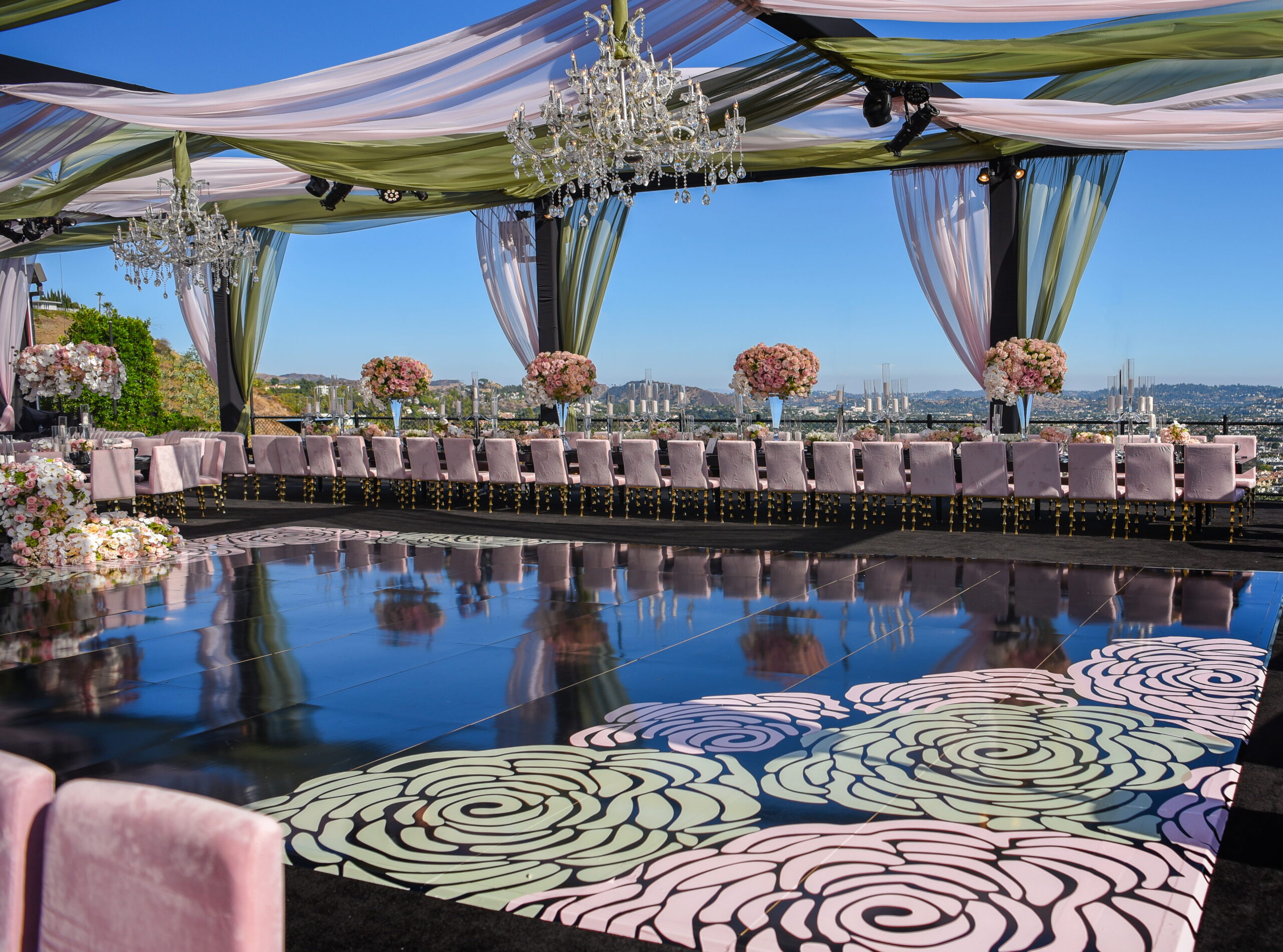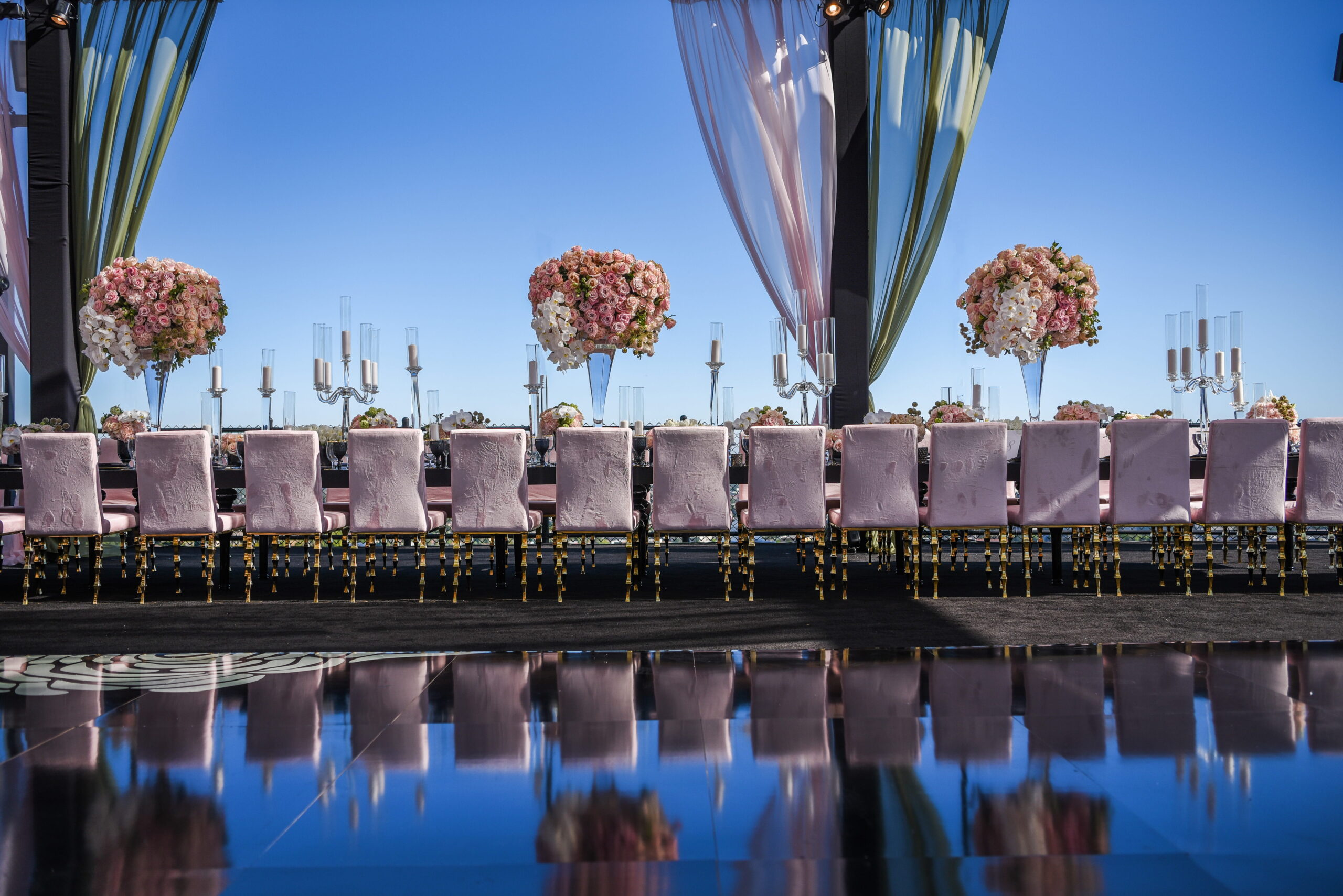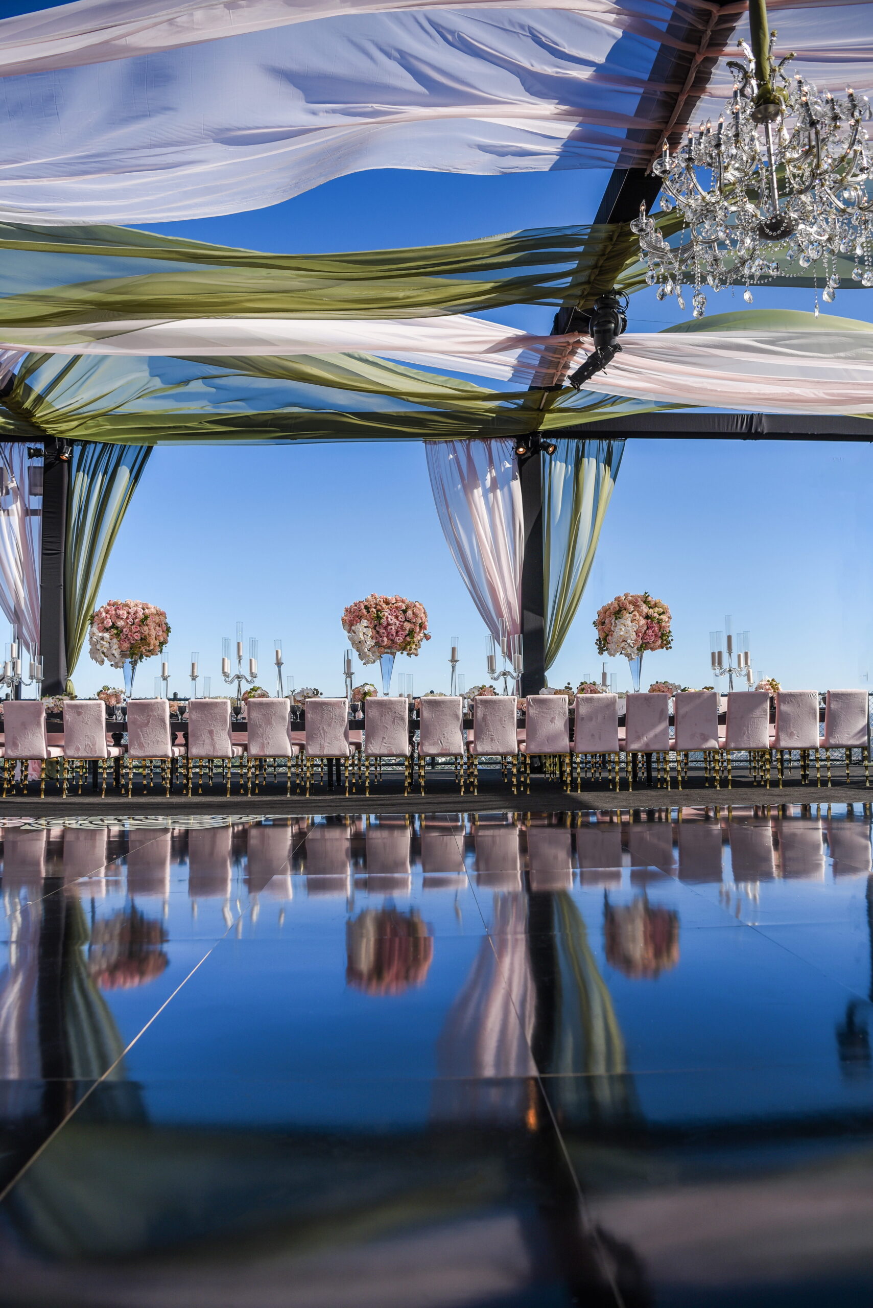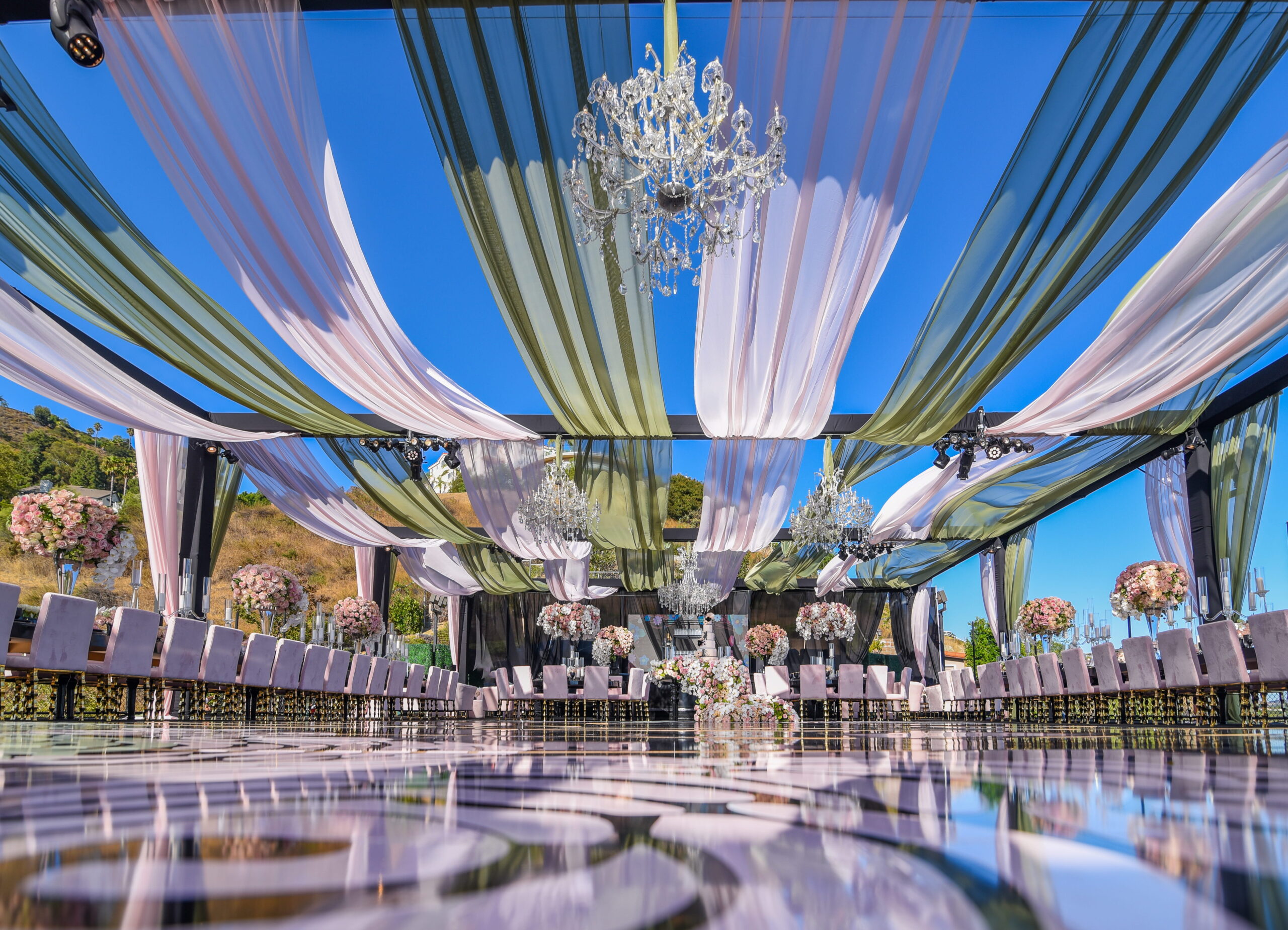 In the heart of California's Central Valley, where farmers build empires, the owner of Peels asked for a wedding worthy of what they had built. We took a refrigerated industrial space and filled it with an inverted golden forest. Thousands of gilded leaves suspended overhead, cascading toward mirror-topped tables dressed in cream and gold. The floor gleamed white. The candles rose like columns. A tiered wedding cake emerged from the canopy like something discovered, not placed. No one who walked in remembered what the room used to be.