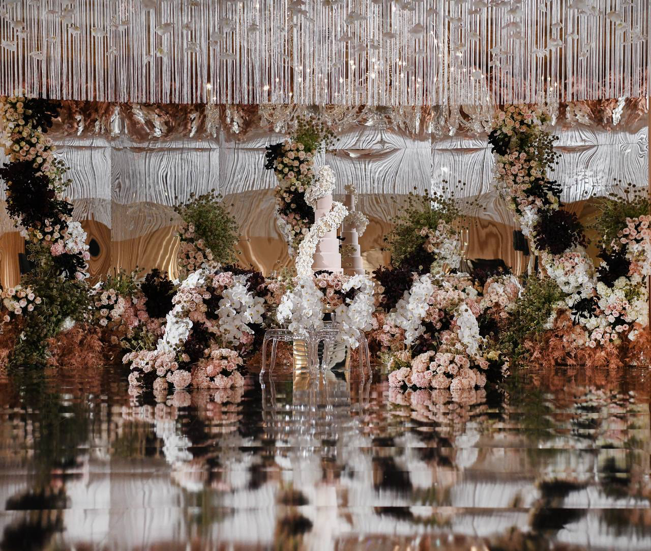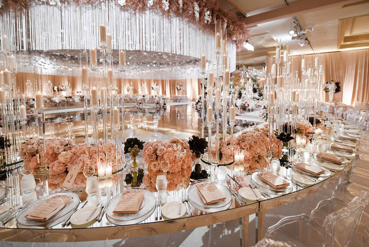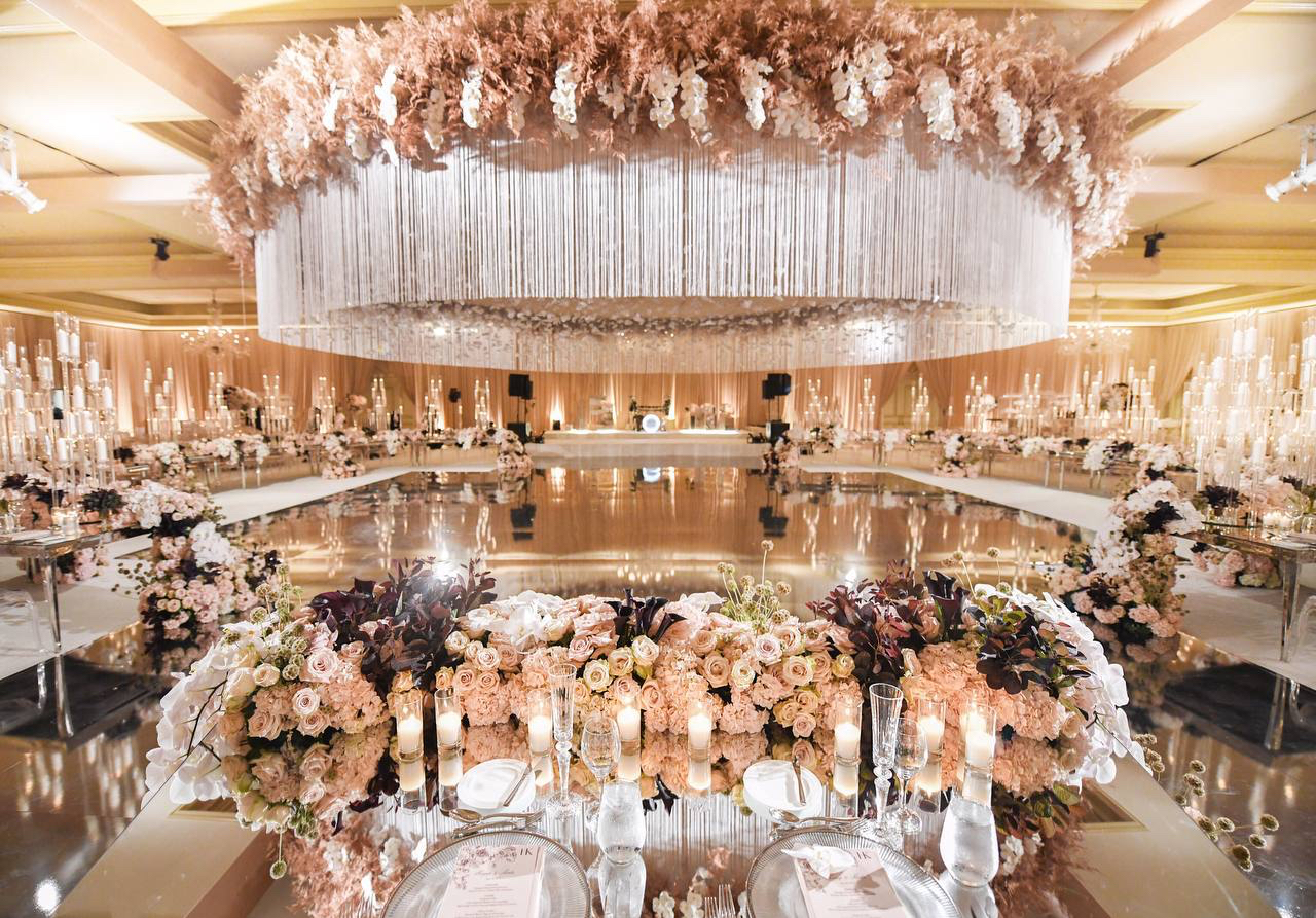 Silver glass feels cold. Bronze had never been done. At the Langham Hotel in Pasadena, we laid a bronze mirror floor that turned the entire room into a living reflection. Orchids and crystal fringe hung from a circular ceiling installation above, their petals suspended mid-fall, caught forever in the warmth of the bronze below. Round tables echoed the circle overhead, bringing the whole world into closure. The bride's gown trailed across the floor and doubled itself in the reflection. Blush roses crowded the tables. Candles rose in glass columns. Everything connected. Everything answered itself. This was the most chic room I had ever built and it started with one question — what if the floor was bronze?