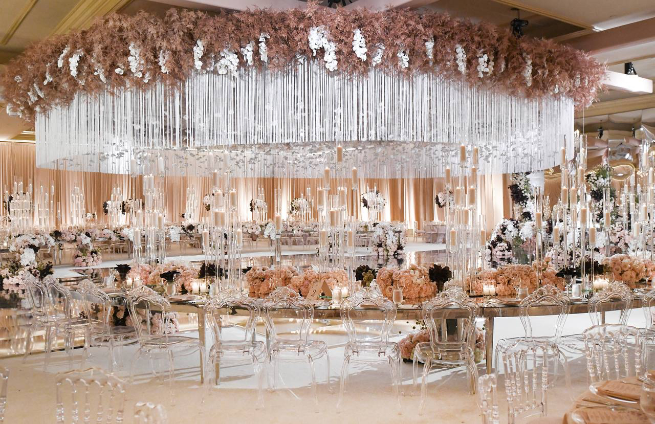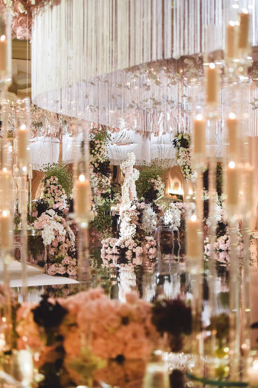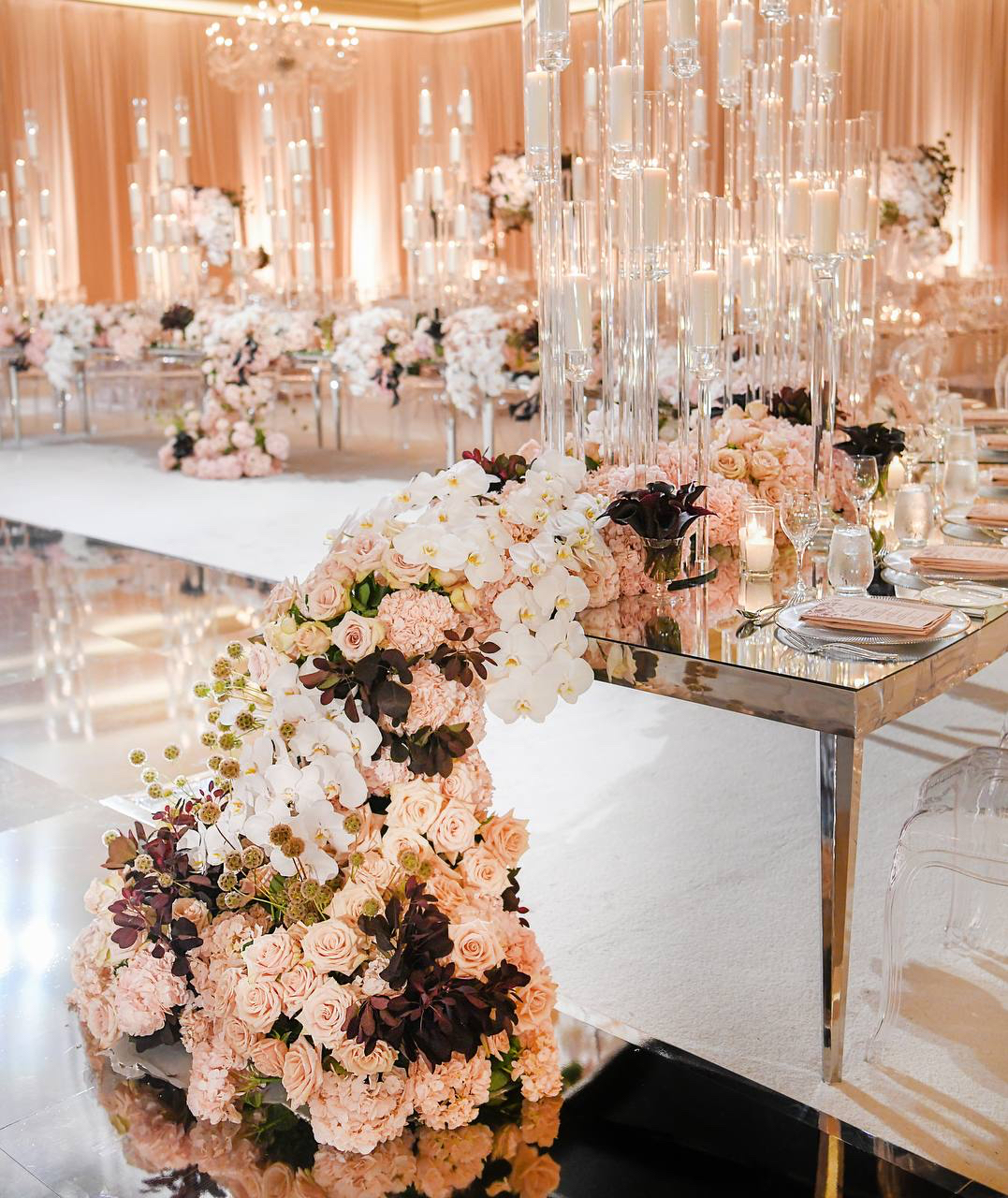Silver glass feels cold. Bronze had never been done. At the Langham Hotel in Pasadena, we laid a bronze mirror floor that turned the entire room into a living reflection. Orchids and crystal fringe hung from a circular ceiling installation above, their petals suspended mid-fall, caught forever in the warmth of the bronze below. Round tables echoed the circle overhead, bringing the whole world into closure. The bride's gown trailed across the floor and doubled itself in the reflection. Blush roses crowded the tables. Candles rose in glass columns. Everything connected. Everything answered itself. This was the most chic room I had ever built and it started with one question — what if the floor was bronze?