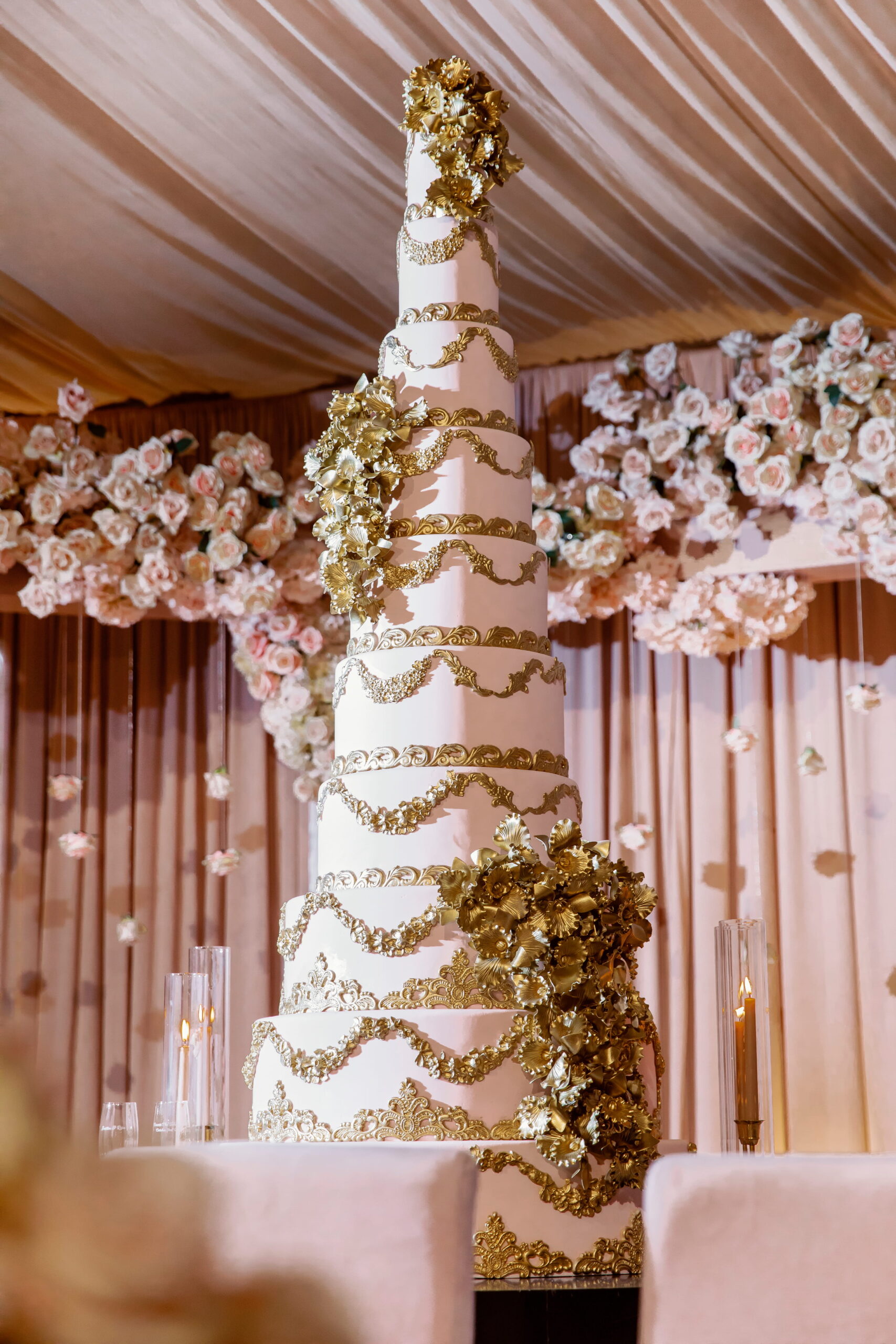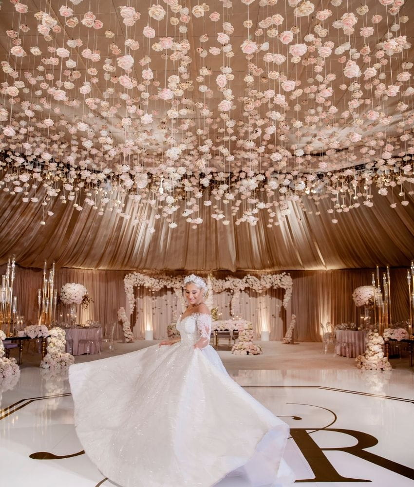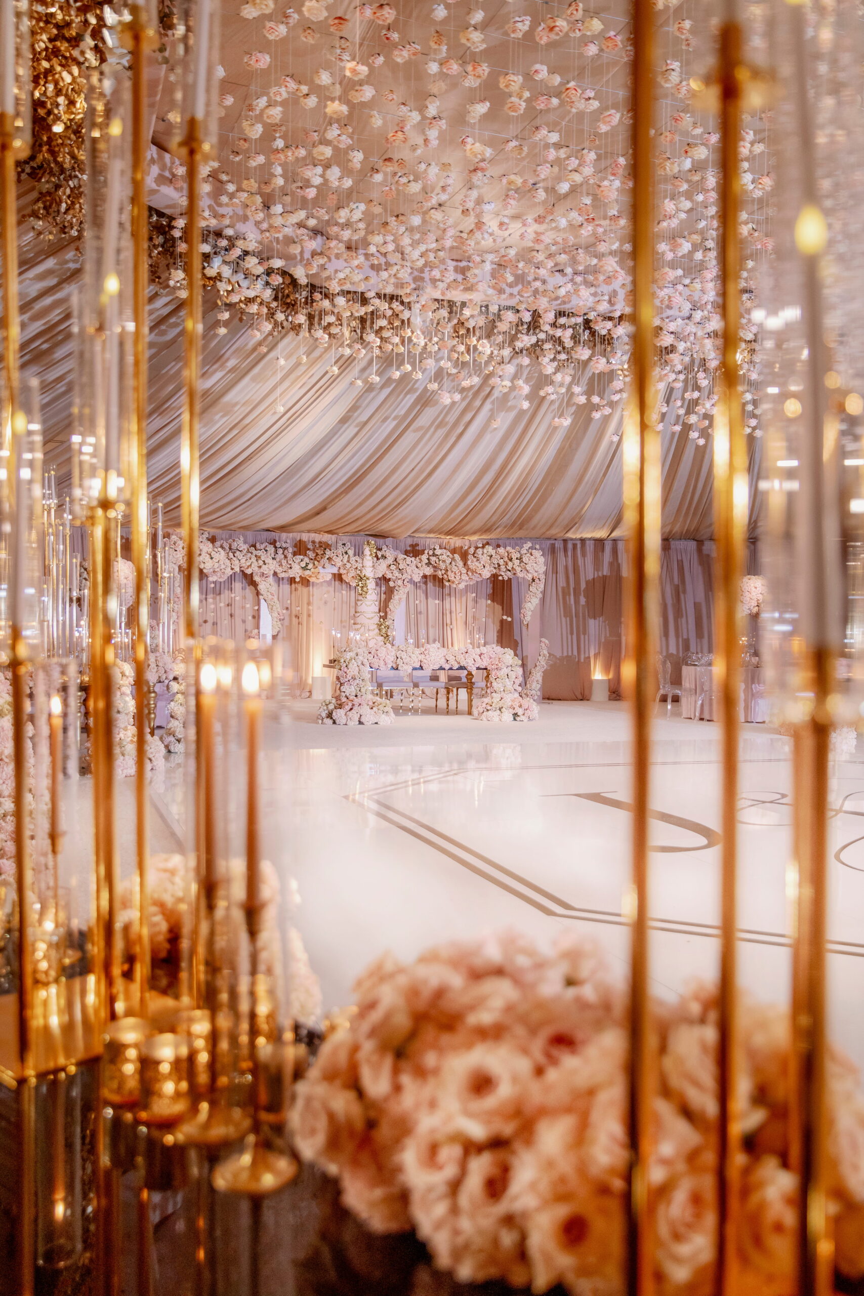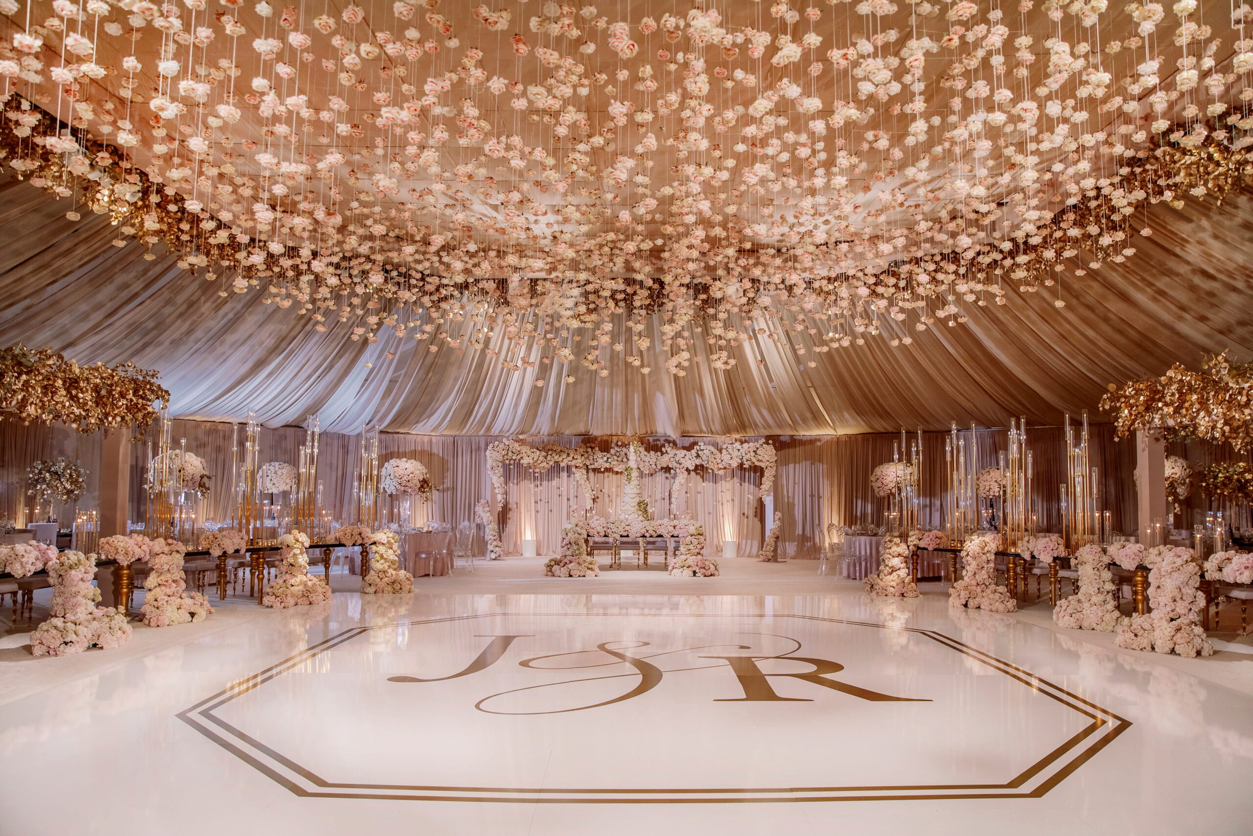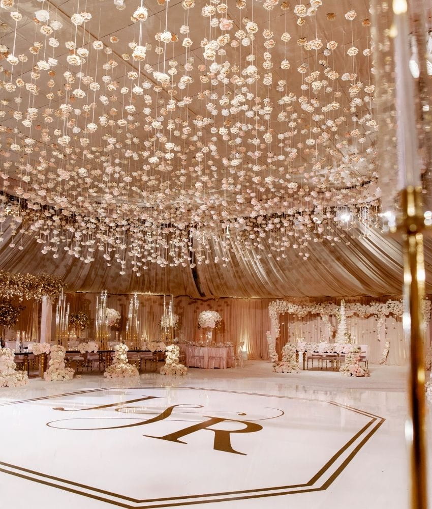 Every designer has a moment when they stop working in circles and rectangles and ask what else is possible. This was that moment. At Garden of Paradise, I built an entire wedding around the hexagon. The dance floor. The seating chart wall. The ceiling structure. The ceremony canopy. Every element spoke the same geometric language, creating a visual coherence that felt both architectural and alive. Hundreds of blush and ivory roses hung suspended from the ceiling on individual threads, filling the tent like a living constellation of blooms. Gold eucalyptus leaves cascaded alongside them, catching the light as guests moved beneath. Outside, a towering floral dome anchored the ceremony against the golden hills. The bride spun on a white marble floor monogrammed in gold. The room was opulent without being heavy. Geometric without being cold. This was the wedding where I learned that the shape of a room can change the feeling of an entire day.
