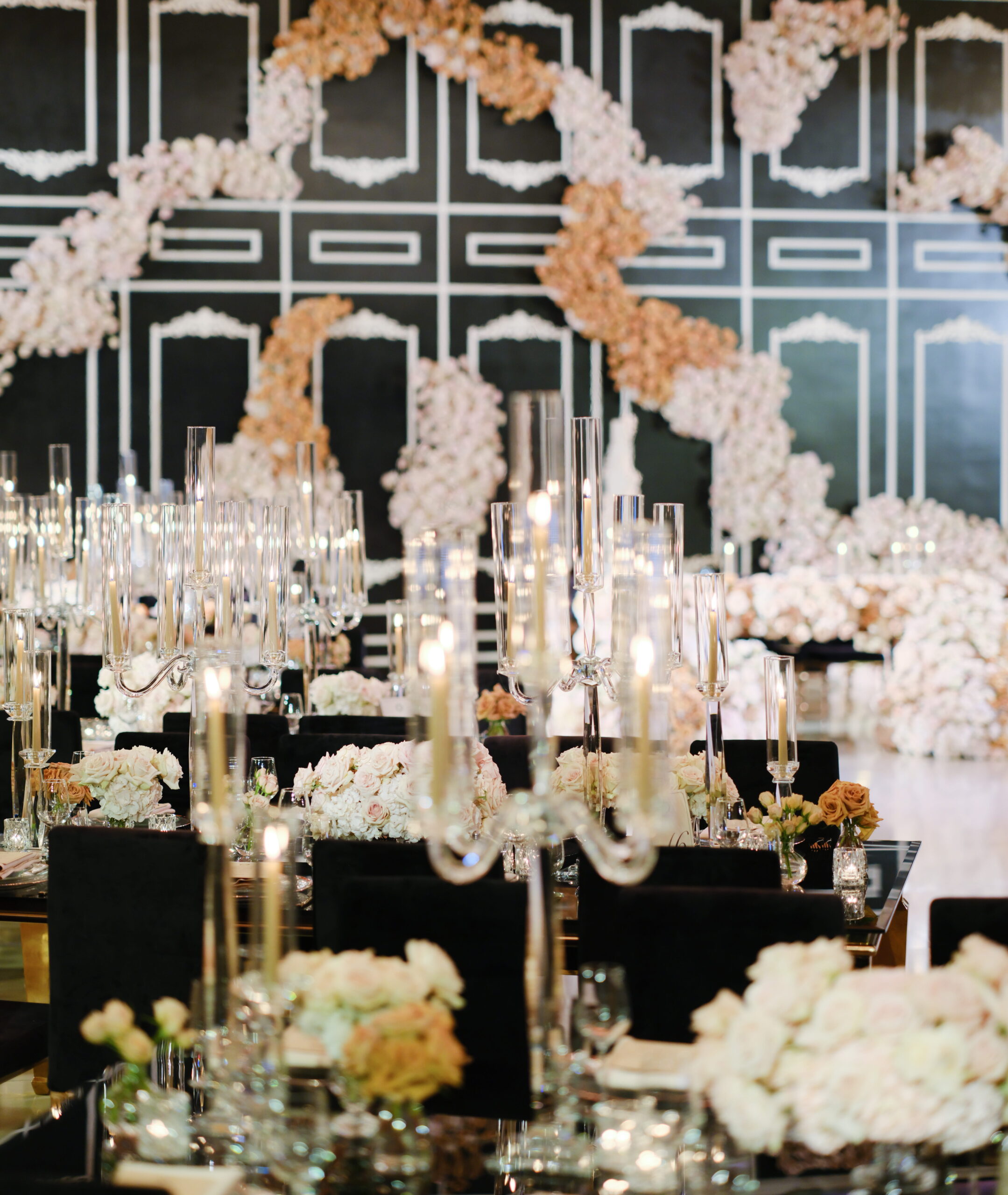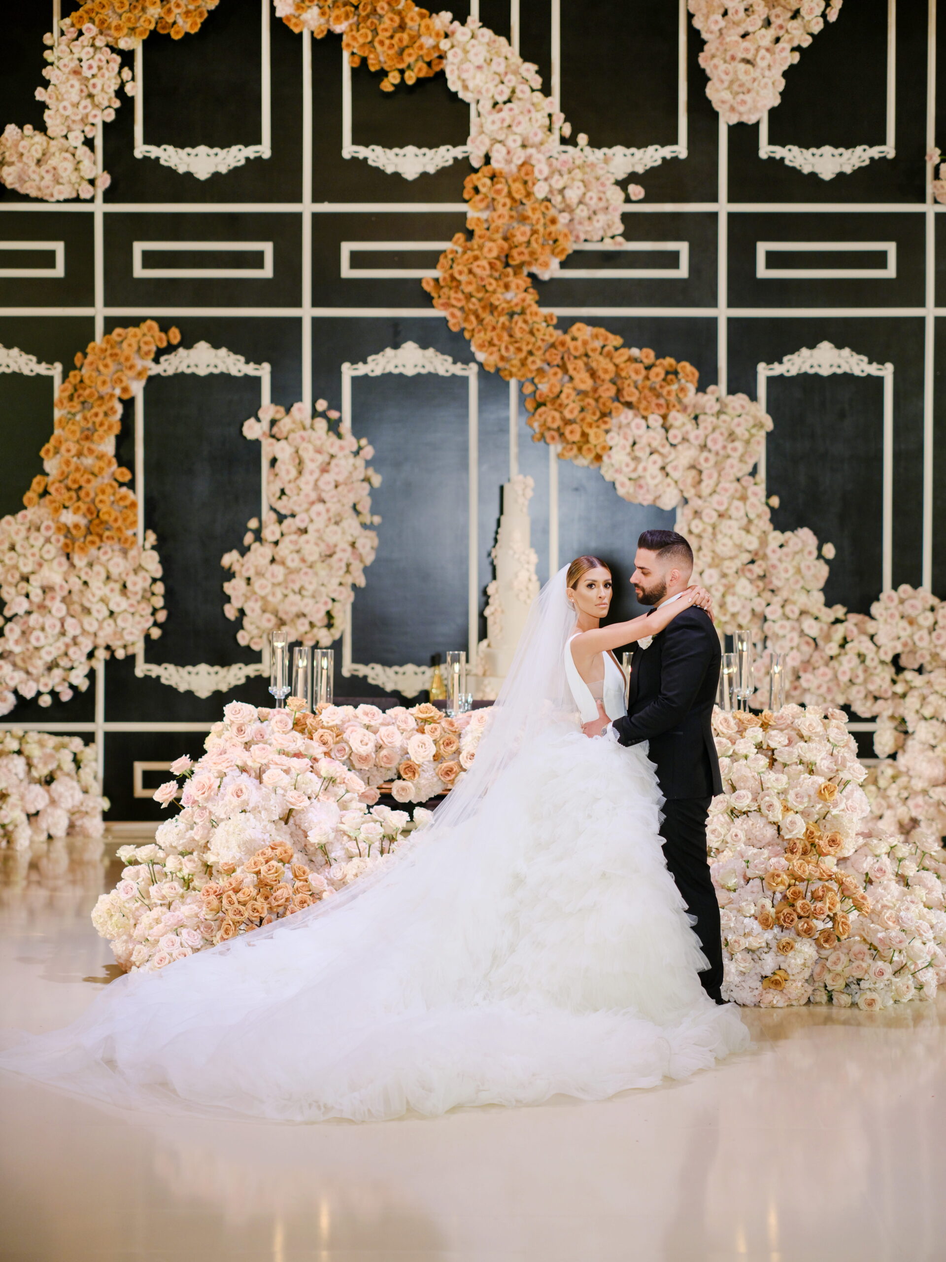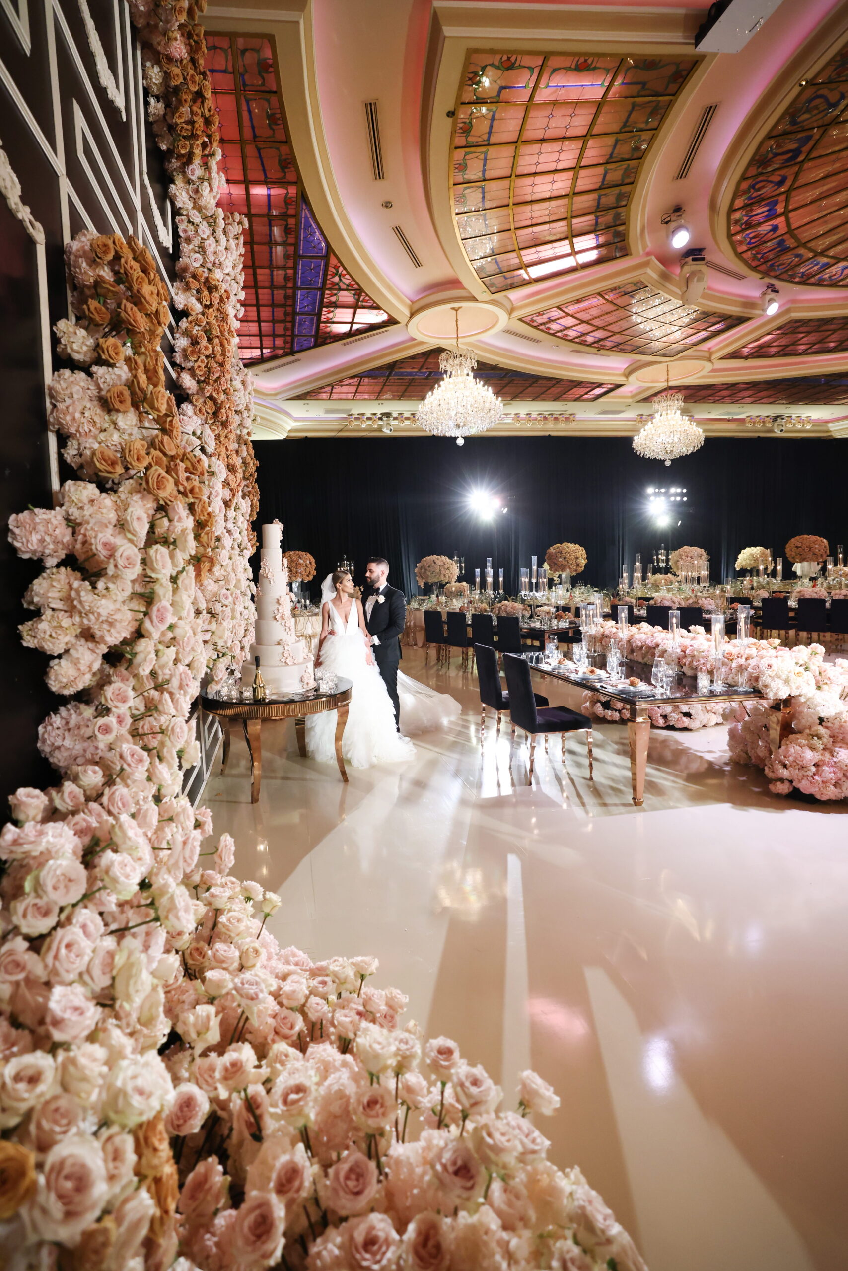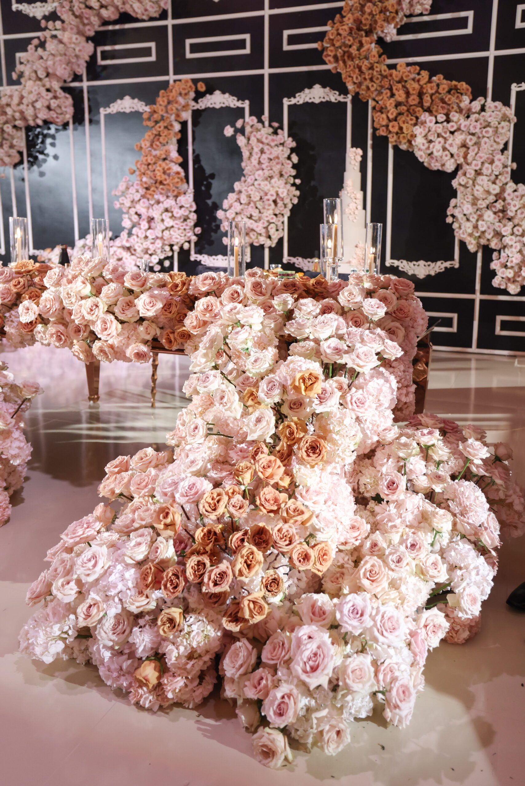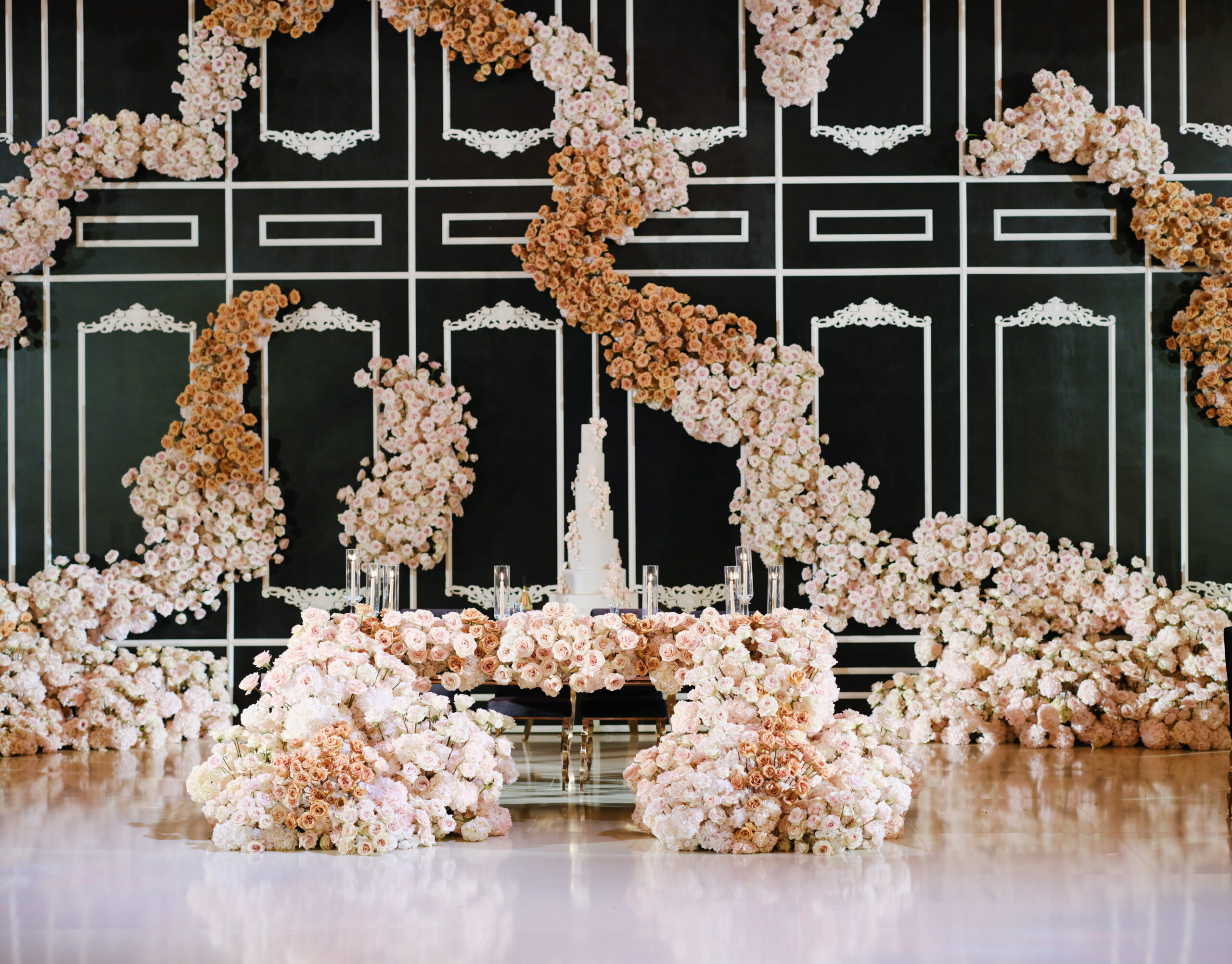 They were busy building their lives. They trusted me to build their wedding. A custom baroque-molded wall was designed and constructed from scratch, its ornate panels becoming the canvas for thousands of blush, peach and ivory roses that spilled across the surface in cascading waves. The florals didn't decorate the wall. They consumed it. Roses tumbled from the ceiling installation down to the floor in unbroken rivers of bloom, framing a tiered white cake at the center of it all. The room's existing architectural grandeur met the softness of an all-rose palette and held it perfectly. This was opulence without excess. Romance without sentimentality. Two professionals handed me their most important day. This is what I gave them back.