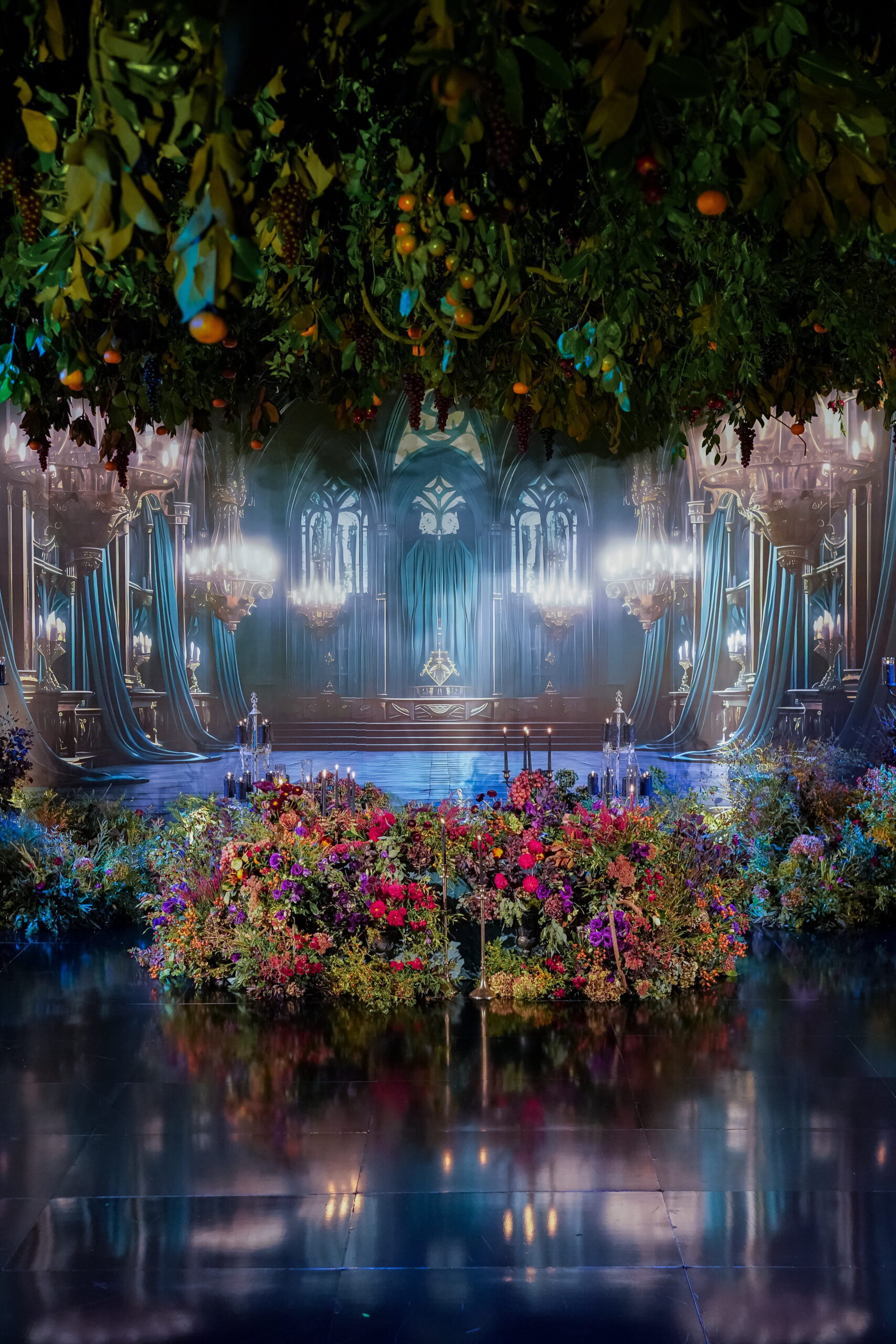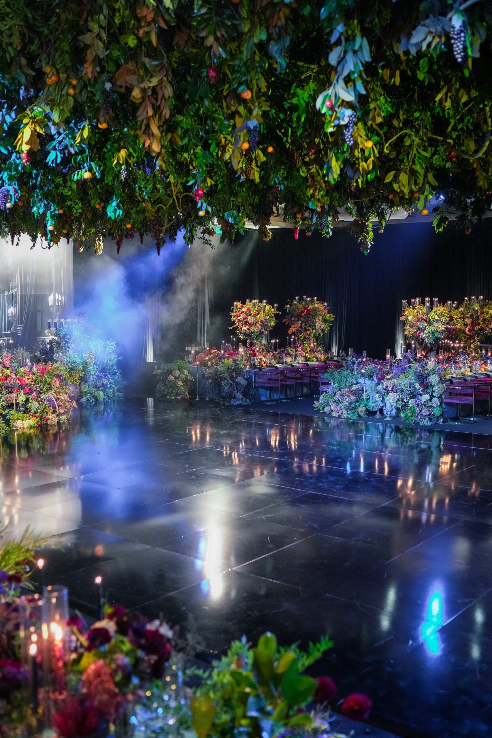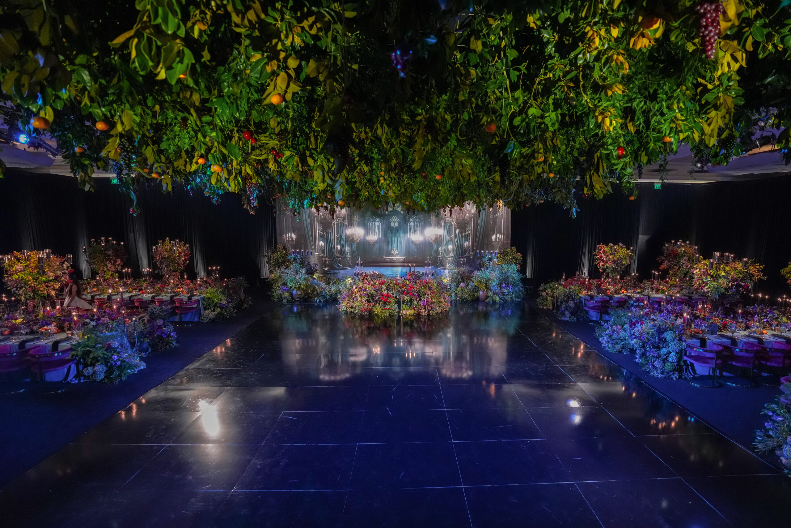 Every designer waits for a bride like this. She walked in and said dark. Gothic. Medieval. Give me something no one has ever seen. So we built a cathedral inside a ballroom. Using Midjourney, I created an original image of a teal gothic cathedral — vaulted arches, towering chandeliers, stained atmosphere — then printed it at monumental scale and wrapped the Paséa ballroom walls in it entirely. The room stopped being a hotel. It became a world from another century. Long feasting tables were buried under cascading arrangements of jewel-toned blooms, clusters of grapes, tangerines and figs spilling between jewel-colored goblets and black taper candles. Haze rolled across the floor. An orchestra in black tie played from the shadows. Aerial performers in teal, magenta and plum moved through the room like figures from a painting that had come to life. Every detail was considered. Every inch was intentional. This was the wedding where I finally got to show the full range of what I am capable of. She trusted the darkness. And the darkness was magnificent.
