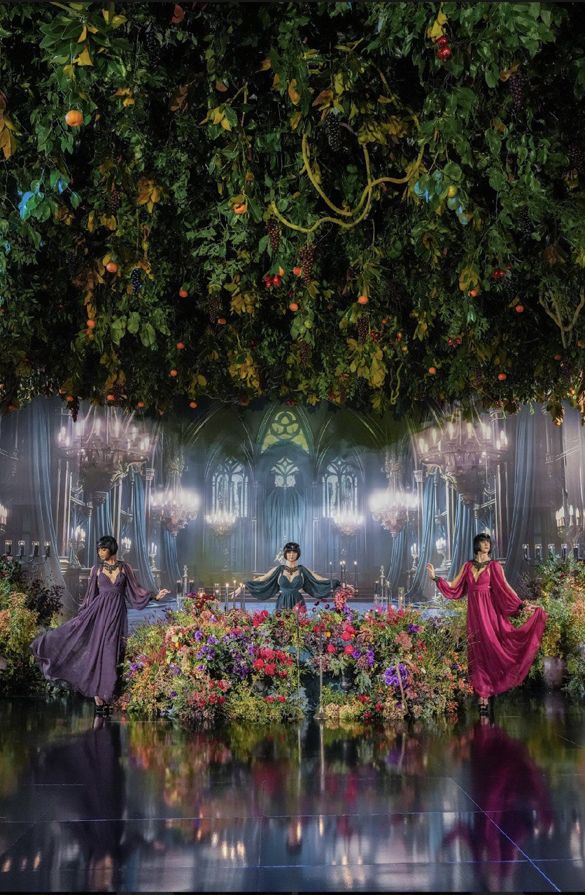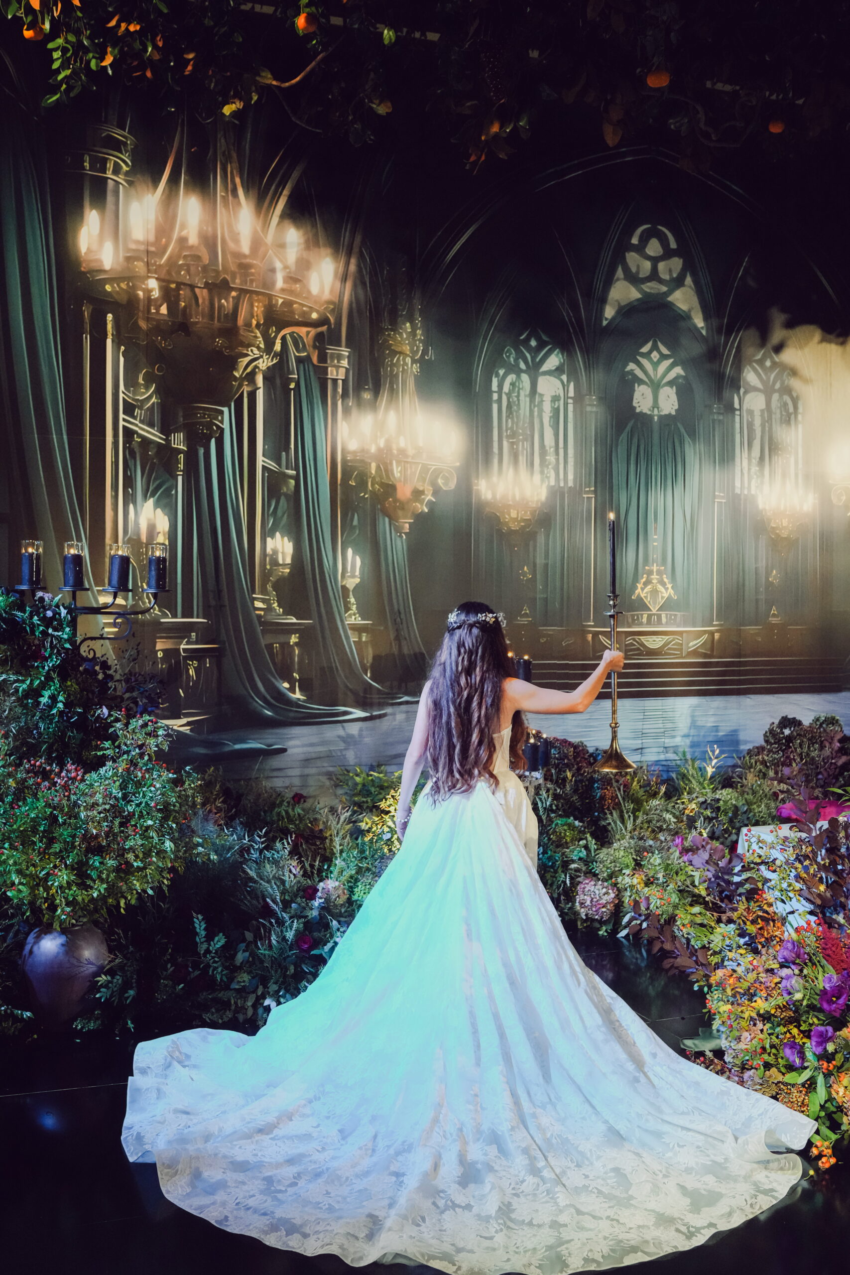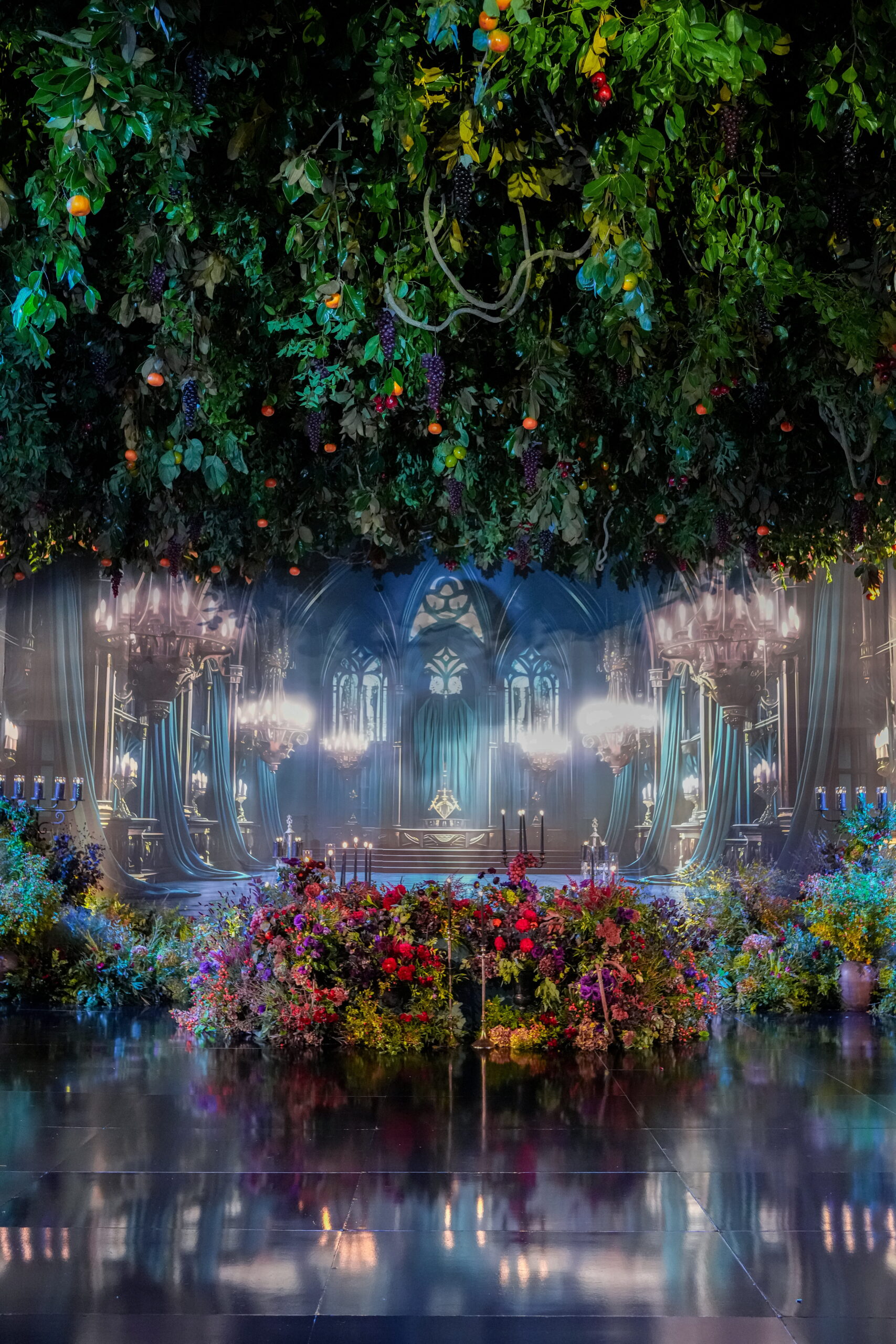 Every designer waits for a bride like this. She walked in and said dark. Gothic. Medieval. Give me something no one has ever seen. So we built a cathedral inside a ballroom. Using Midjourney, I created an original image of a teal gothic cathedral — vaulted arches, towering chandeliers, stained atmosphere — then printed it at monumental scale and wrapped the Paséa ballroom walls in it entirely. The room stopped being a hotel. It became a world from another century. Long feasting tables were buried under cascading arrangements of jewel-toned blooms, clusters of grapes, tangerines and figs spilling between jewel-colored goblets and black taper candles. Haze rolled across the floor. An orchestra in black tie played from the shadows. Aerial performers in teal, magenta and plum moved through the room like figures from a painting that had come to life. Every detail was considered. Every inch was intentional. This was the wedding where I finally got to show the full range of what I am capable of. She trusted the darkness. And the darkness was magnificent.